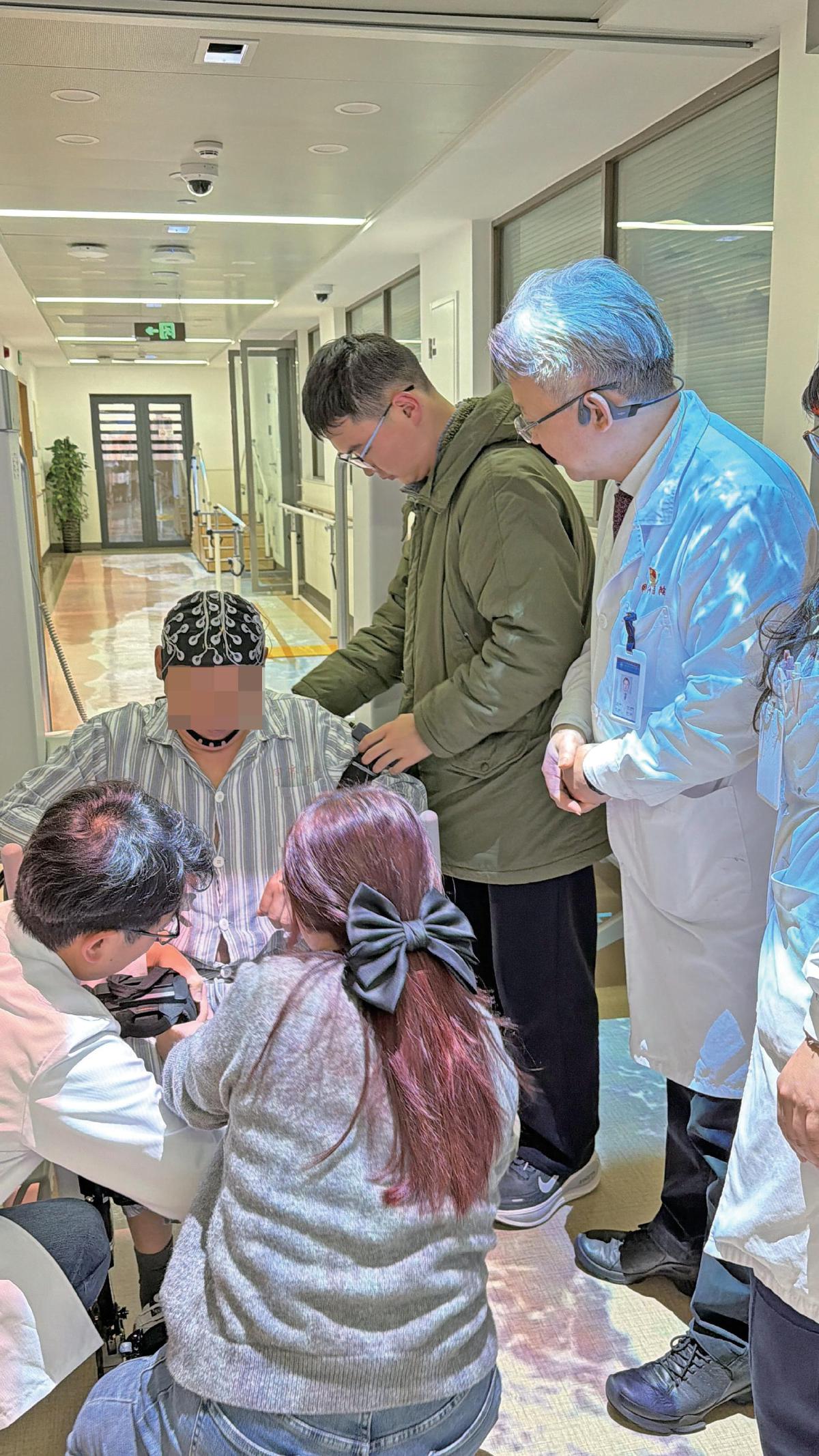 在同济大学附属同济医院同康楼骨科研究型病房里,3日试机,蓝色脑电帽贴紧头皮,叶文闭了一下眼,然后想:抬右腿,通过意念让外骨骼机器人带动腿部完成迈步动作。“电脑上会提示你准备开始,自己想迈右腿,它在电脑上提示成功了,腿就动了。”他向记者描述那一刻,语气平静,像在说一件终于发生的事。